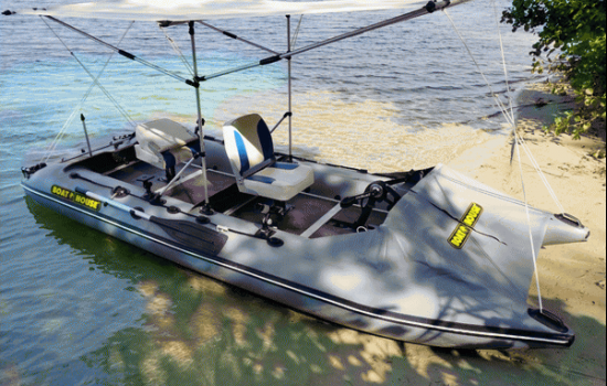 The unique inflatable pvc catamaran SMART FISHER 440 with pedal drive is designed for outdoor activities - walking, traveling, fishing. The double bike ride is equipped with everything for your comfort and safety - soft swivel seats, a sunshade, comfortable steering, a large waterproof locker, as well as an anchor roller, fishing rod holders, and an echo sounder platform.