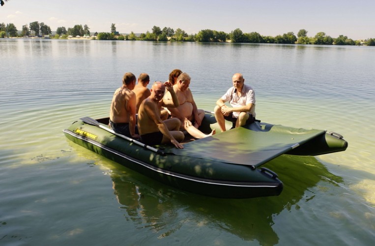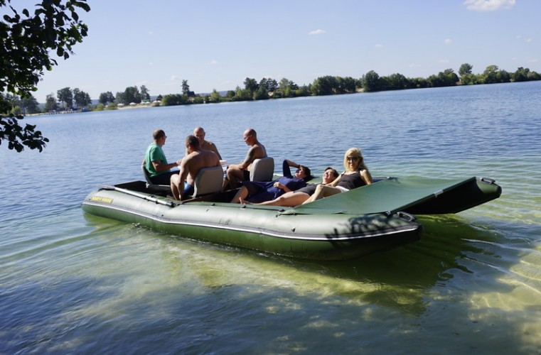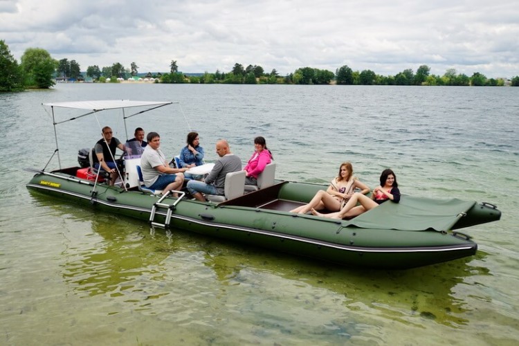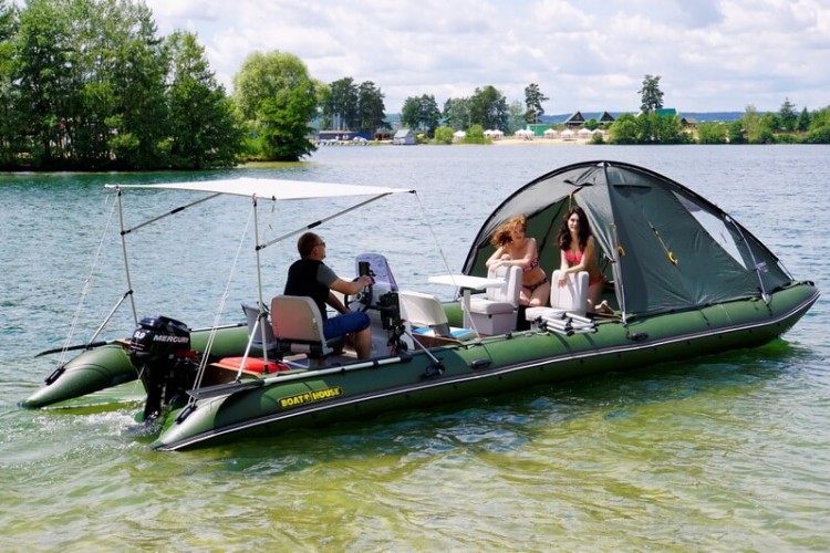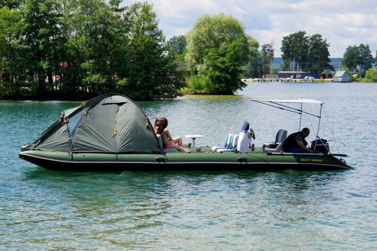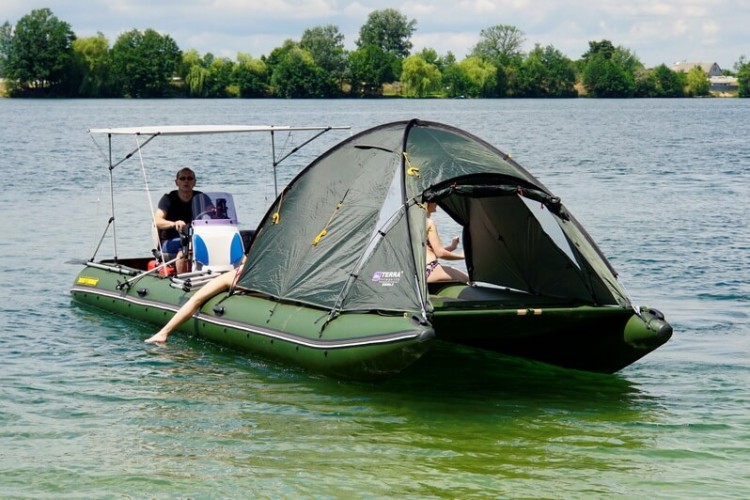 TRAVEL catamarans are perfectly fit for relaxation and traveling with your family or company. You can sunbathe and swim, fish and hunt, cook and eat, travel and live on the water. In just a few minutes you can inflate special flooring made off PVC, and put two-layer tent 3 + 1, securely fastened to the boat. If this is not enough, you can add one or two side platforms, turning your catamaran into large comfortable cruiser, which comfortably accomodate 7 adults and 3 children! The total used area of this Boathouse can reach 20 square meters and load capacity - almost 2t! Sleeping on the water in a boat is very comfortable - warm, soft and cozy. And most importantly - entirely safe.