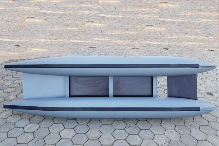 Catamaran construction made of German PVC fabric, density 750, length 270 cm and width 90 cm: cylinders, 32 cm in diameter, platform with hard flooring with non-slip surface (125 cm by 62 cm), two luggage seats with rubber fasteners (front and rear ), Floor decks, 2 transverse frames, 4 handles, paddle holders, cylinder protection from below and stabilizers of the roadside stability in the rear. Coming SUP-KAT is very simple in a few minutes, has a carrying capacity of 200 kg, weighs only 13 kg and is placed in a folded state in a small bag-backpack.